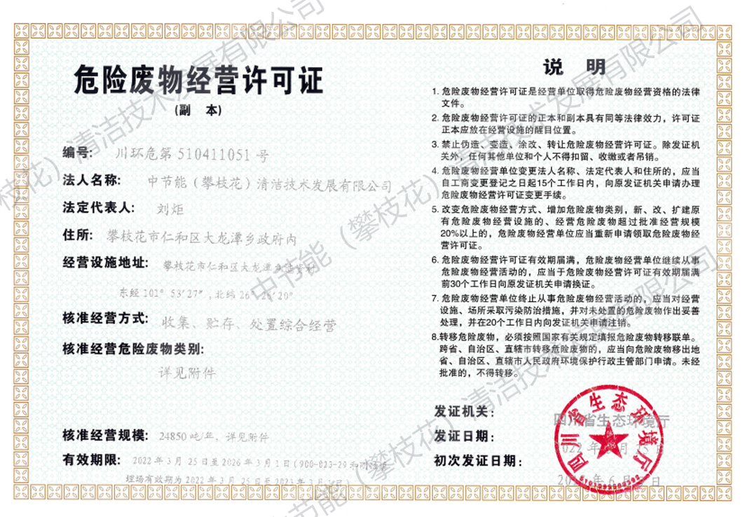 中節(jié)能(攀枝花)清潔技術(shù)發(fā)展有限公司(以下簡稱公司)成立于2008年5月,注冊資金1.6519億元。公司由中節(jié)能清潔技術(shù)發(fā)展有限公司和攀枝花市產(chǎn)業(yè)投資經(jīng)營有限責(zé)任公司共同持股,并由中節(jié)能清潔技術(shù)發(fā)展有限公司控股經(jīng)營。公司投資建設(shè)和運營的攀枝花市危險廢物處置中心項目是全國統(tǒng)籌部署的全國31個危險廢物綜合處置中心項目之一,位于攀枝花市仁和區(qū)大龍?zhí)多l(xiāng)迤資村華賣社,核準處理原生廢物2.425萬噸/年,可對43大類,447項(醫(yī)療廢物)進行安全處置。